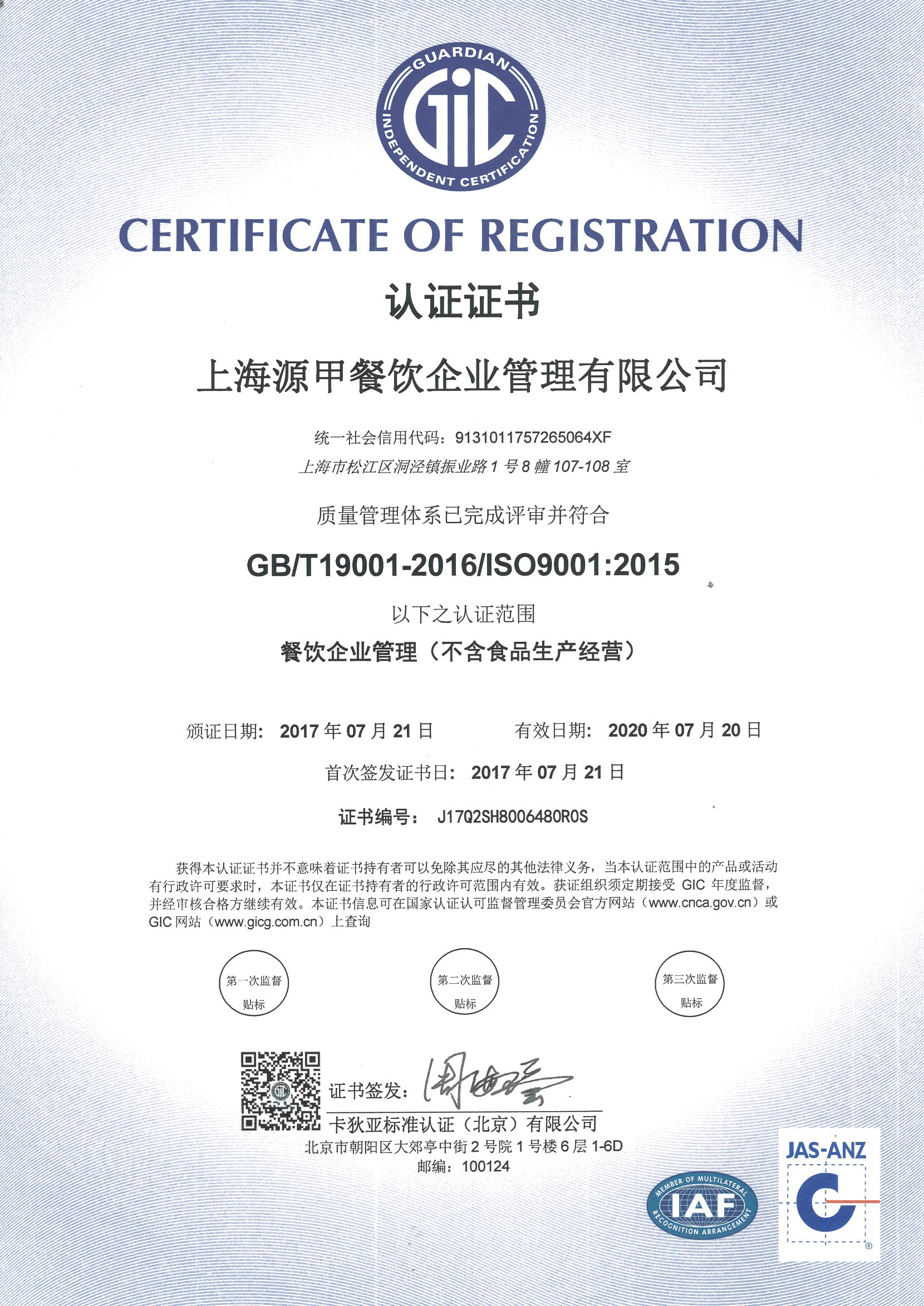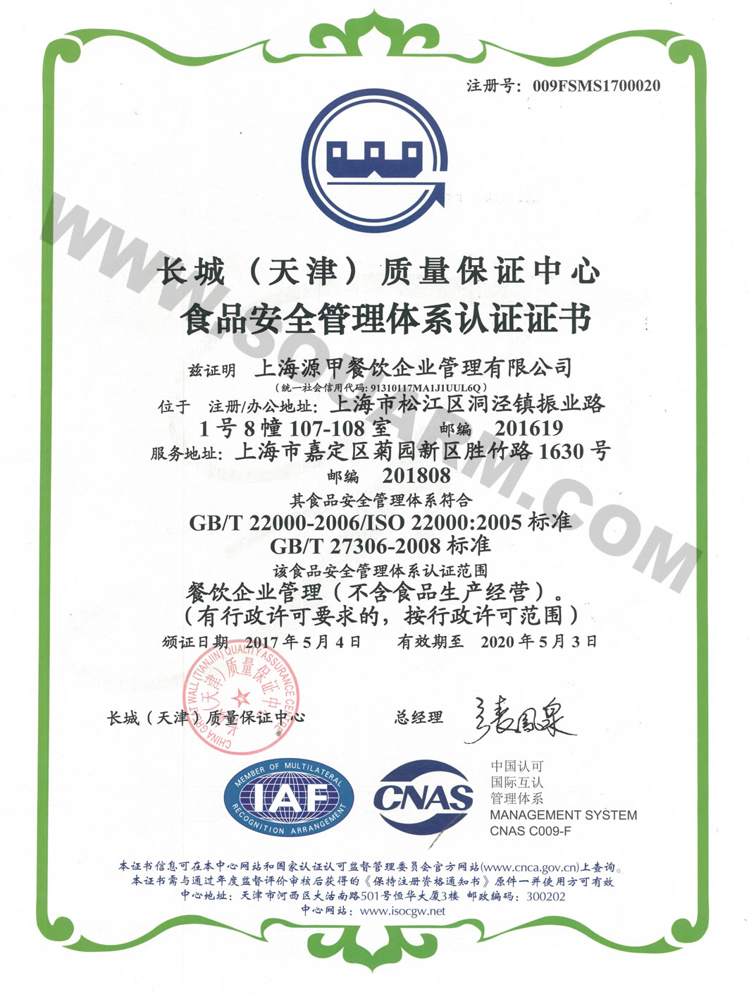 ISO22000食品安全管理體系認證證書