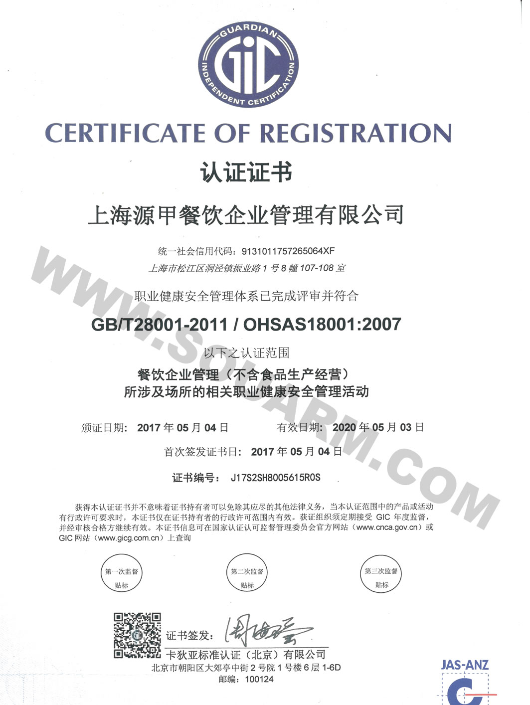 OHSAS18001職業健康安全管理體系認證證書