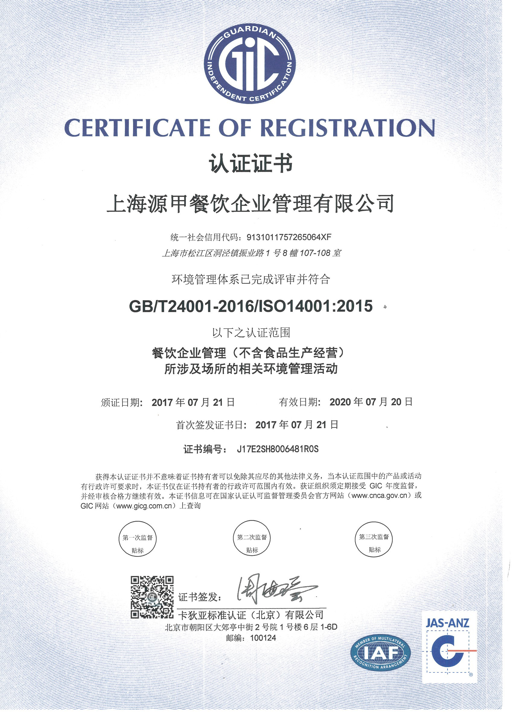 ISO14001環境管理體系認證證書